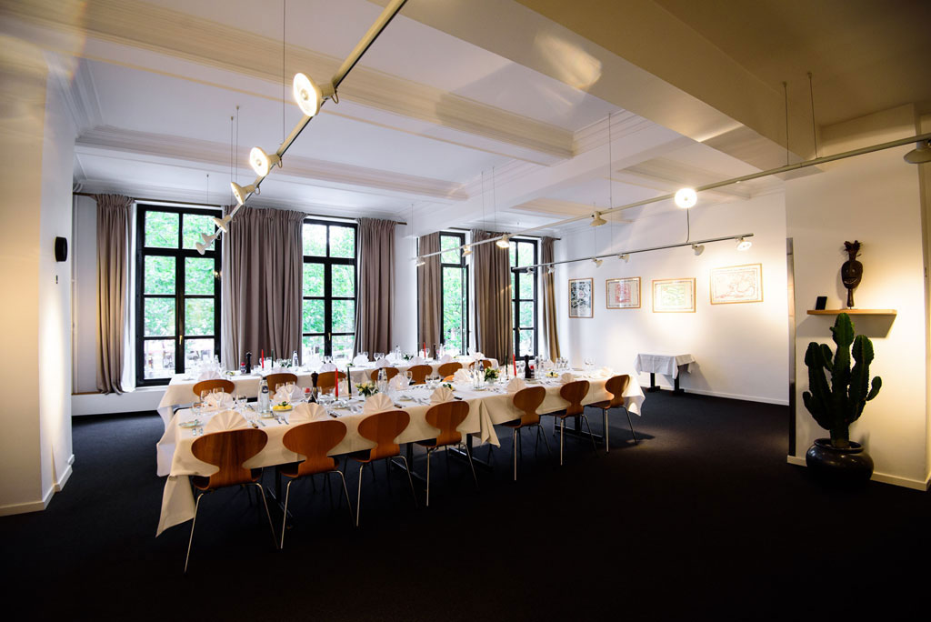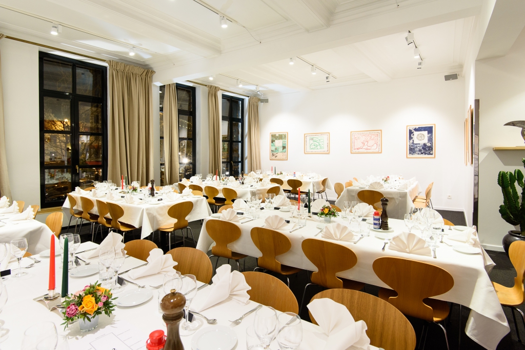 Découvrez la prestigieuse salle d'Au Vieux Saint Martin dont les murs sont décorés de lithographies de Pierre Alechinsky et d'œuvres d'art africaines. Au Vieux Saint Martin vous propose différentes formules sur mesure et leurs offres sont adaptables en fonction de votre évènement, avec des animations possibles (cours d'œnologie, clown, etc ,...). Salle modulable : organisation des tables en T, en U, en carré ou encore en rectangle.
